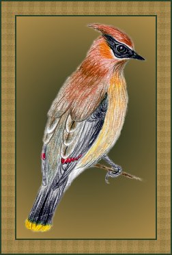 The Cedar Waxwing (Bombycilla cedrorum) is about 7 inches in length and is very easy to recognize. They love to eat wild fruit, insects, and especially berries. They are found in this area (western North Carolina) year round, but they move around to eat the food that is available and will leave an area once the food is exhausted. Because of this, you will find them in the woods, rural and suburban areas, but never in one place for very long. They tend to nest in the late summer when there is a good supply of small fruits and berries to feed their young. They build nests of grasses, twigs, and mosses lined with fine materials in the fork or branch of a tree 4 to 50 feet above the ground. They lay 2 to 6 eggs that are pale blue with dark marks. They are a very social bird that will perch in a row with lots of other waxwings, passing a berry or insect down the line and back again, bill to bill, until one bird eats it. They will even do this during nesting season, unlike other birds that tend to stay and feed together only in nesting pairs.