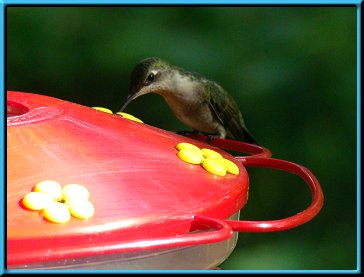 NO HUMMERS? There are several reasons you may not get any hummingbirds at your feeders, provided you live where it does get warm for at least part of the year. One is that there may be few flowers, shrubs, or trees in your area that hummingbirds like, and they may not travel to your area and will not "find" your feeder. If there are too many good food sources in the area, they may not bother with feeders. Some hummingbirds may just not want to eat at feeders. Hummingbirds may move away from the feeders to different areas to breed. And, once again, the feeders need to cleaned and fresh solution kept in them to keep hummingbirds. Also, unless you are watching, they may come and go so quickly that you never see them. But keep at it, you may just spot them. You also can attract them by planting trees for shade, perching, and nest building. Plant flowering shrubs and plants to give them natural nectar sources, and this will also attract the insects that they eat too. Having water is valuable too. They get most of their drinking water through nectar, but them bathe too. They especially enjoy a "spray" fountain. BREEDING AND NESTING: THE LOCAL HUMMINGBIRD: The Ruby-throated (Archilocus Colubris) weighs less than 3g (one tenth the weigh of a first class letter). and is no more than 3 3/4 inches long. They are found as far north as Hudson Bay in Canada, and are the predominant species found in western North Carolina (where I live).